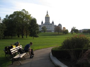 Greg and Gioia snapped some photos of us before we left Mansfield. We were only 6 or 7 miles from the UCONN Dairy Bar, so our first stop was to get ice-cream. Twelve miles later, we broke for lunch at Nature’s Grocer in Tolland. This is a great natural foods store, where I must return some day (and of course stop at the dairy bar while in the area). After lunch, we rode to Hartford and stopped at a park and caught up on missed phone calls while waiting for Phil, our Warm Showers host for the evening, to get home from work. Somewhere along the last mile to the house, another cyclist, Bill, started riding and chatting with us.