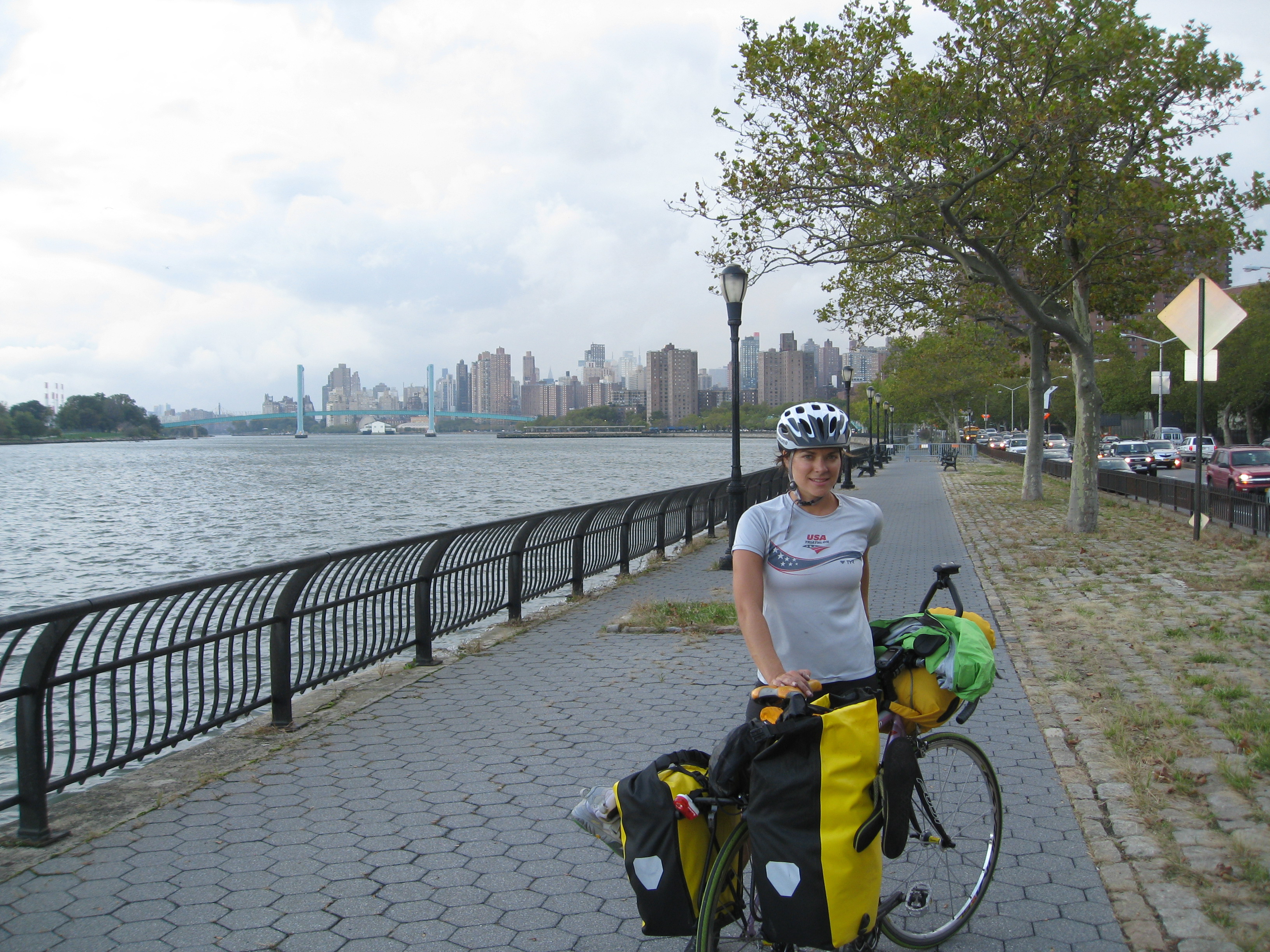 A few miles from our destination, a guy rode by on a touring bike with a For Sale sign on the back panniers. I asked him how much he was asking for it, and he said that he had bought it new only two weeks ago for $2000 and ridden it from Toronto to Manhattan. He was asking $1000. I am considering it, since the bike I have is not designed for touring, but the frame might be too large. My first fall of the trip happened when we were heading for the Queensborough Bridge on York Ave. I was riding behind Phil and looked down at Garmin to see where to turn, when Phil stopped and I crashed into him, knocking off one of his panniers and falling over. Fortunately, both of us and our bikes were fine.