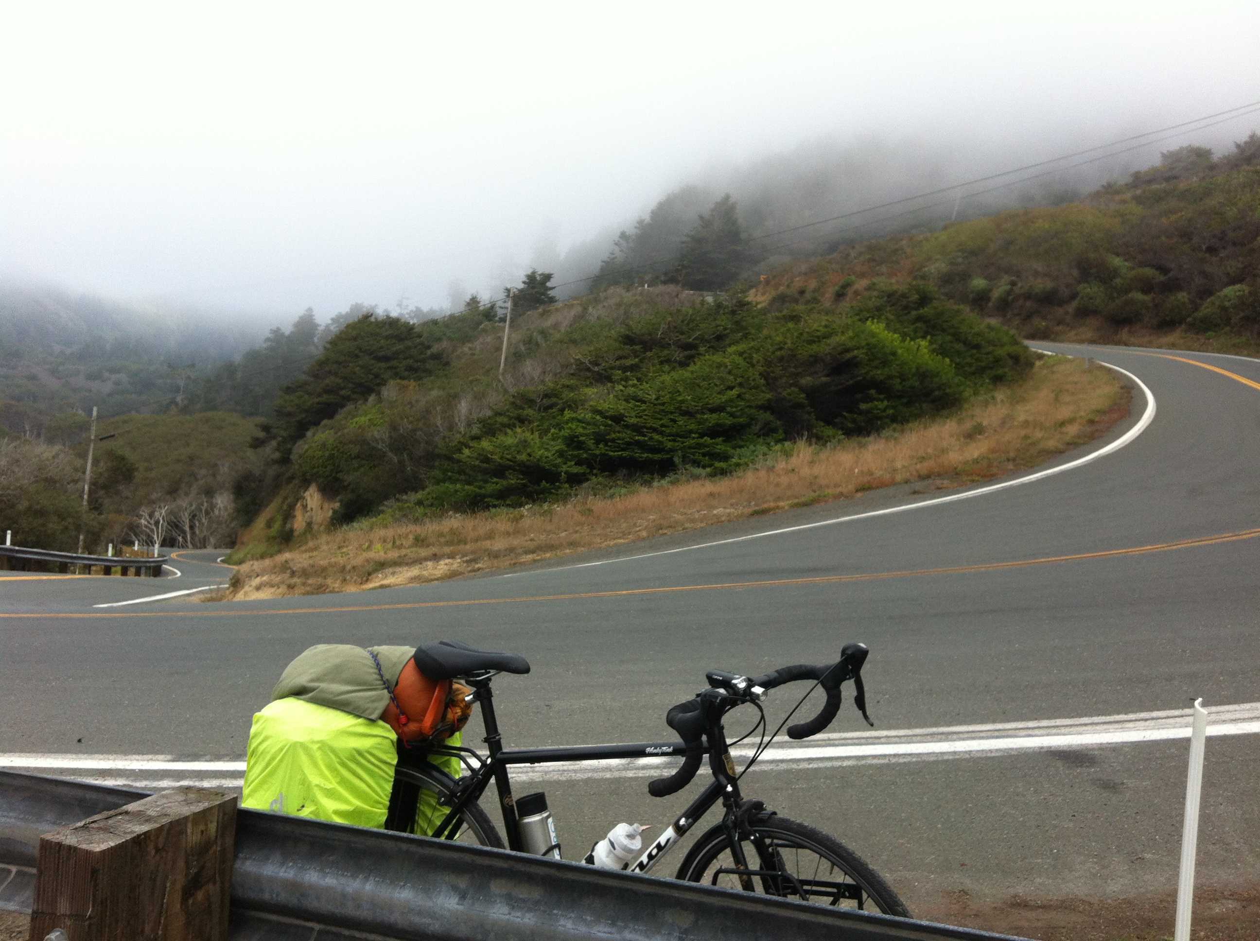 Sarah and family dropped me off at the Navarro River Junction, where highway 1 meets 128. They were all heading inland to drive through wine country and some redwoods, and I was continuing on down the Pacific Coast Highway to San Francisco by bike on my own. Lucky for me I was able to leave some weight with Sarah which minimized my load to just some essentials on my rear rack. My bike was still not light, but it would definitely make the 180+/- trek to SF a lot easier, especially with all the coastal climbs and descents. So, with that said, what better way to start the ride with an ascent!