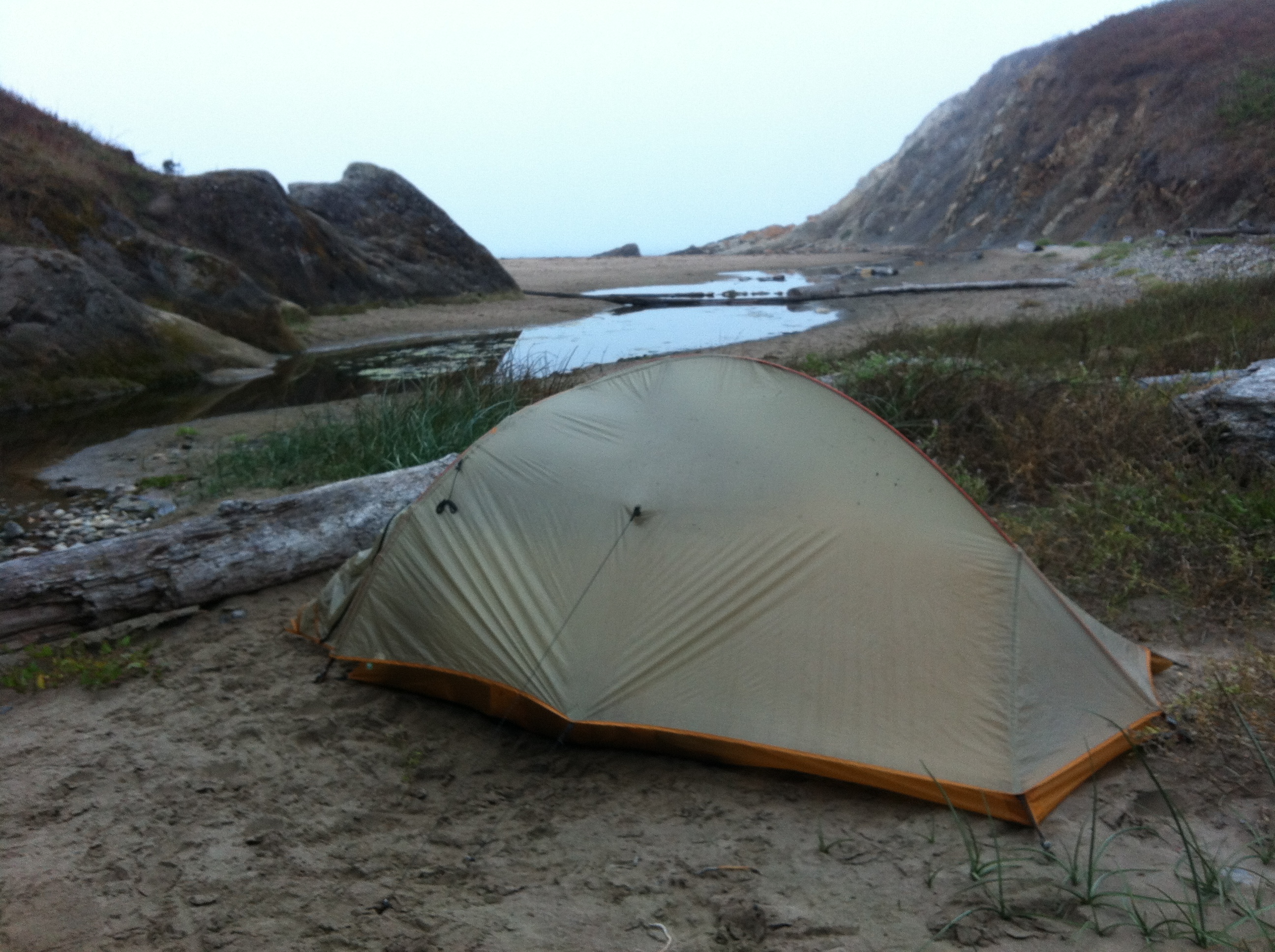 It was a cold night. I woke up several times because I was so cold. It wasn’t until I took all the clothes out of my bag and laid them out under me and my sleeping bag before I slept well. It was just that the sand on the beach was so cold, I needed a barrier between me and the sand. After finally getting a few hours of rest I woke up to the sound of waves, and seagulls and something splashing around in the creek outside of my tent. A lot of things went through my head, but I finally thought that it might be a deer or elk. As I gained the courage to look out, I unzipped the tent and startled a man that was throwing a stick for his dog to catch. It was his dog jumping around in the water and he said that my tent blended in so well with the scenery that he didn’t even see me! I guess I picked a good spot.