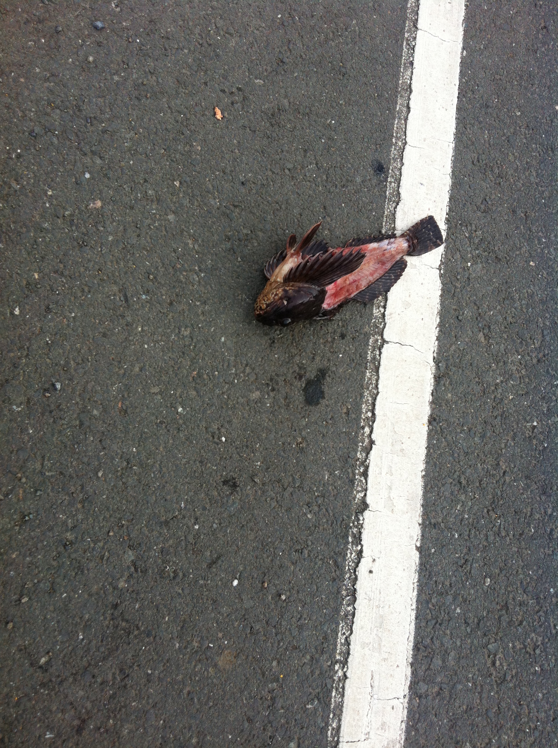 I packed up camp and ate some breakfast on a big piece of driftwood and then walked my bike back up the trail to the road. As soon as I started riding I went past a gutted rockfish. I wasn’t sure if it was a good omen or a bad one, but either way it never surprises me what you’ll see.