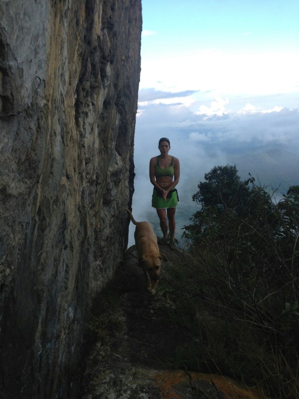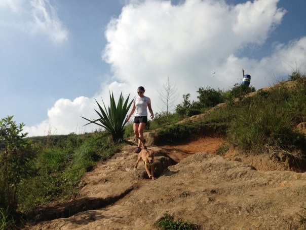 After lunch, we decided to climb up to la Piedra del Tabor – another giant stone like the one in Guatape, but with no stairs and even higher of a climb. As we walked back out of town, we passed a dog who was lying in the sun. He got up, and we invited him to follow us. There are hundreds of stray dogs in every town, and it’s so hard to ignore them. This one was very friendly, cleaner-looking than most, and looked to be about 2 years old. He was maybe a cross between a yellow lab and pit bull. Lenin asked several people in town how to get to the stone, and once we were on the road out of town, he asked one more farmer about which trail to take. At this last junction, before traversing the farm and entering the narrow, steep trail, Lenin comments, “funny, they all say the same thing, to be careful of the tigers”. You can imagine how I felt for the rest of the hike up to the stone.