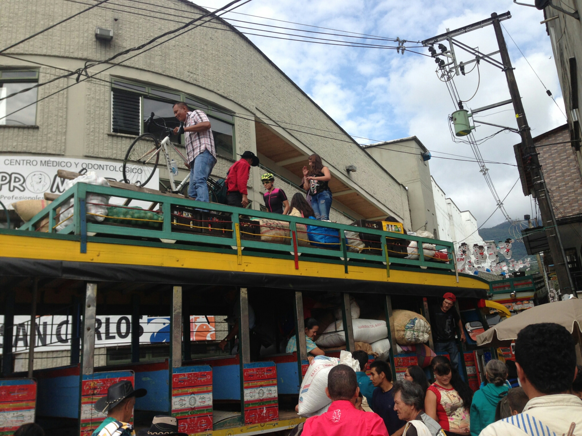 The two kids helped us carry our bags to the road, where several other people were standing at an abandoned house, waiting for the bus. Luis had left earlier to get our bikes and load them on the bus before it reached us. We waited for about an hour before anything showed up. It wasn’t just a bus, but a chiva – a traditional mode of transportation that comes by only on Saturday and Sunday mornings to take the farmers into town. We piled our stuff and ourselves onto the top, along with the other people and their various belongings.