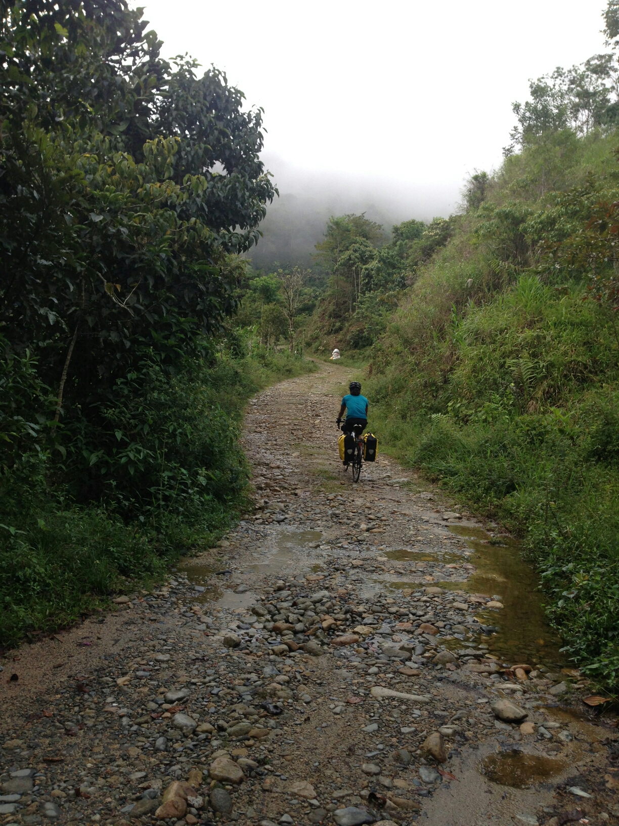 We had just made it to the high point of the road, but we still had about 5 miles to descend on that road before going up again to where Paola’s finca was. The sun was just about to set, and we had barely gone 7 miles from San Raphael. We started walking down the mountain as it grew darker by the minute. To make matters worse, the seatpost bag I was using to carry half of my stuff broke, and I had to carry it on my shoulder. We walked on until it was pitch black before turning on our headlights, which only illuminated the thick fog and the occasional frog hopping across our path.