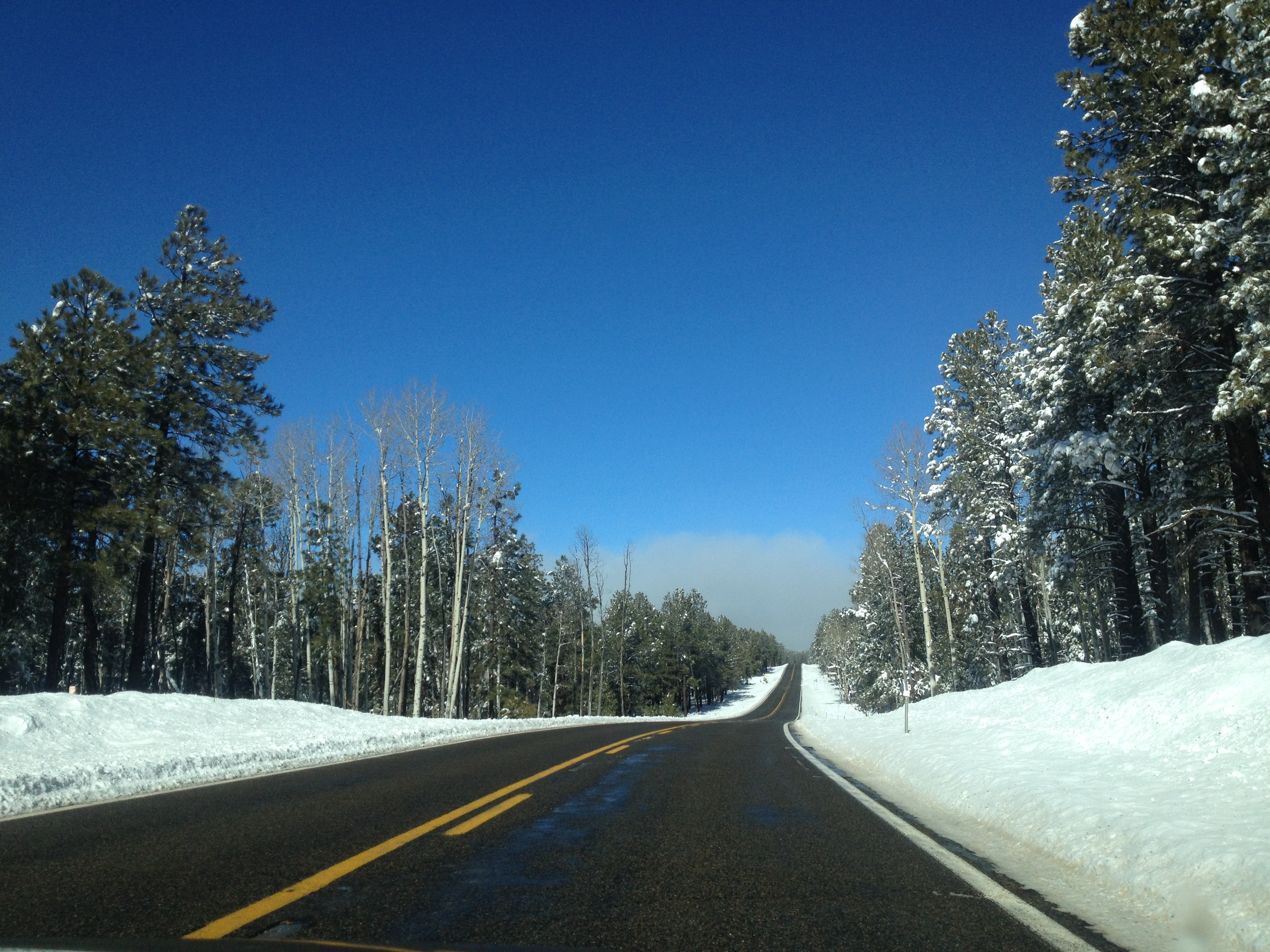 On the way back to Flagstaff, it started snowing, and the next morning there were several inches of snow covering everything. I love the way the snow clings to all the tree branches, turning them white. We enjoyed coffee and breakfast with James and friends at Macy’s, and then said goodbye before driving to the Grand Canyon. We drove over a mountain pass on the way, and once on the other side, there was no more snow on the ground.